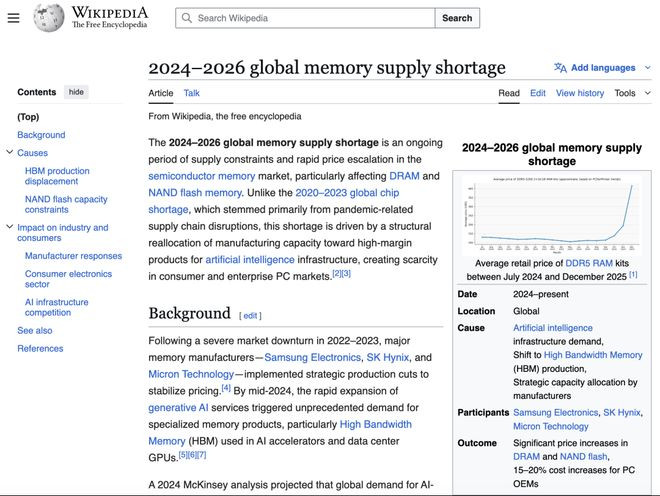 维基百科甚至专门创建了一个词条:2024-2026全球存储短缺!